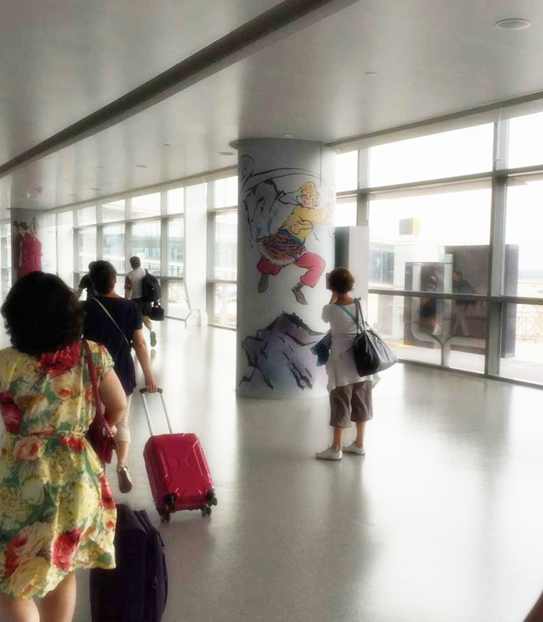 下了飛機(jī)疲憊的倦容適合欣賞一些美景,隨著輕輕的步調(diào),環(huán)顧四周,灰白色的墻上已換上新裝,沒有半點(diǎn)亂花漸欲迷人眼的浮躁感,不驕不躁的水墨情呈現(xiàn)給燈箱是再合適不過的,整個(gè)T2航站樓的長廊儼然開拓了一副新天地,斜陽西照,深色的柱子上一幅幅西游記的經(jīng)典場景回放著映入眼簾,穿過獨(dú)具特色的長廊,陽光透過玻璃墻,照射在灰色的地面上。恢弘大氣的長廊里,有一種內(nèi)斂含蓄的文化底蘊(yùn)在涌動,長廊如紙,柱體如虹,旅客的性情、思緒,融入在造型、筆墨、意蘊(yùn)之中,整個(gè)長廊里流動著平實(shí)敦厚,溫潤超逸的謙謙之音,旅客亦喜焉,似樂也。
