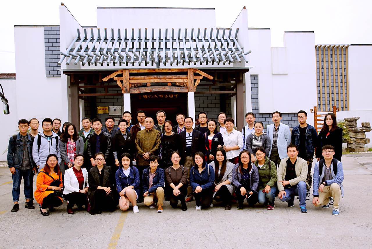 鼎盛絲綢董事長吳建華與蘇豪傳媒副總經理單鳳艷率參展團在中國宋錦文化園前合影