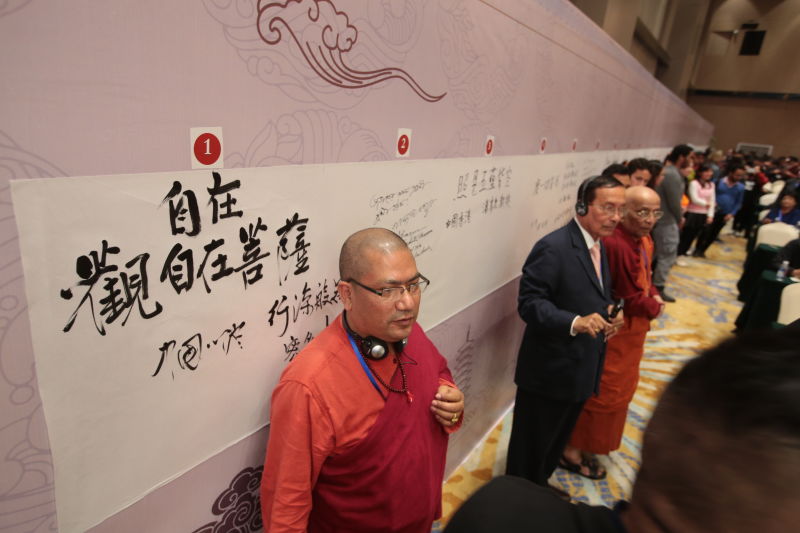 開(kāi)幕式舉行了“一帶一路”沿線國(guó)家代表書(shū)寫(xiě)《心經(jīng)》儀式,來(lái)自30個(gè)國(guó)家的學(xué)者、高僧、大使館參贊、留學(xué)生代表共同用本國(guó)語(yǔ)言書(shū)寫(xiě)了《心經(jīng)》。并從多個(gè)角度加以研討,從這篇古代先哲引導(dǎo)人們追求至善至美至真的經(jīng)文中感悟不朽的精神境界,意義十分重大。