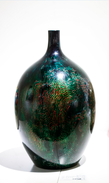 大漆作品《藏石》,以宜興紫砂為胎體,結(jié)合傳統(tǒng)大漆工藝,經(jīng)由作者當(dāng)代審美設(shè)計(jì),使兩種古老技藝重?zé)ㄉ鷻C(jī)。作品富有創(chuàng)意地將紫砂與大漆裝飾相結(jié)合,通體幽靜,設(shè)計(jì)巧妙,制作精良,是不可多得的精品。
