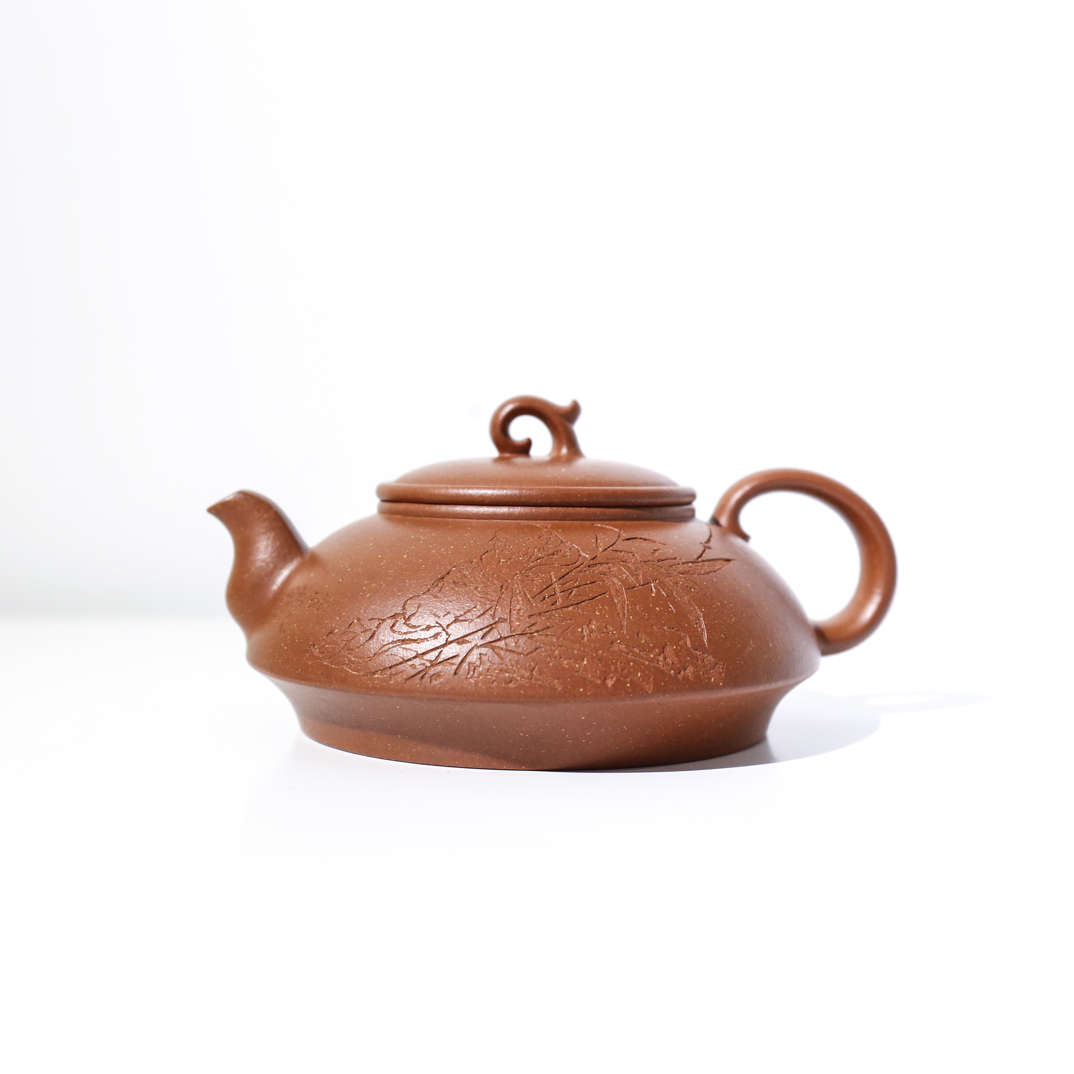《新姿》一壺設(shè)計(jì)于丁酉早春,設(shè)計(jì)的靈感來(lái)源于一盆案頭水仙。“幽姿冉冉弄晴煙,玉蕤暈碧曉肌鮮。”作品精選黃龍山原礦紅降坡泥料,泥料色澤紅潤(rùn),油脂極好。制作時(shí)充分考慮三維一體的空間理念,作品的每一個(gè)視角都力求把握線條的美感與整體的協(xié)調(diào)性。壺身部分的線條則緩沖流暢,于明暗轉(zhuǎn)折、虛實(shí)對(duì)比中凸顯出此壺的溫潤(rùn)、凝重、古雅之風(fēng)。