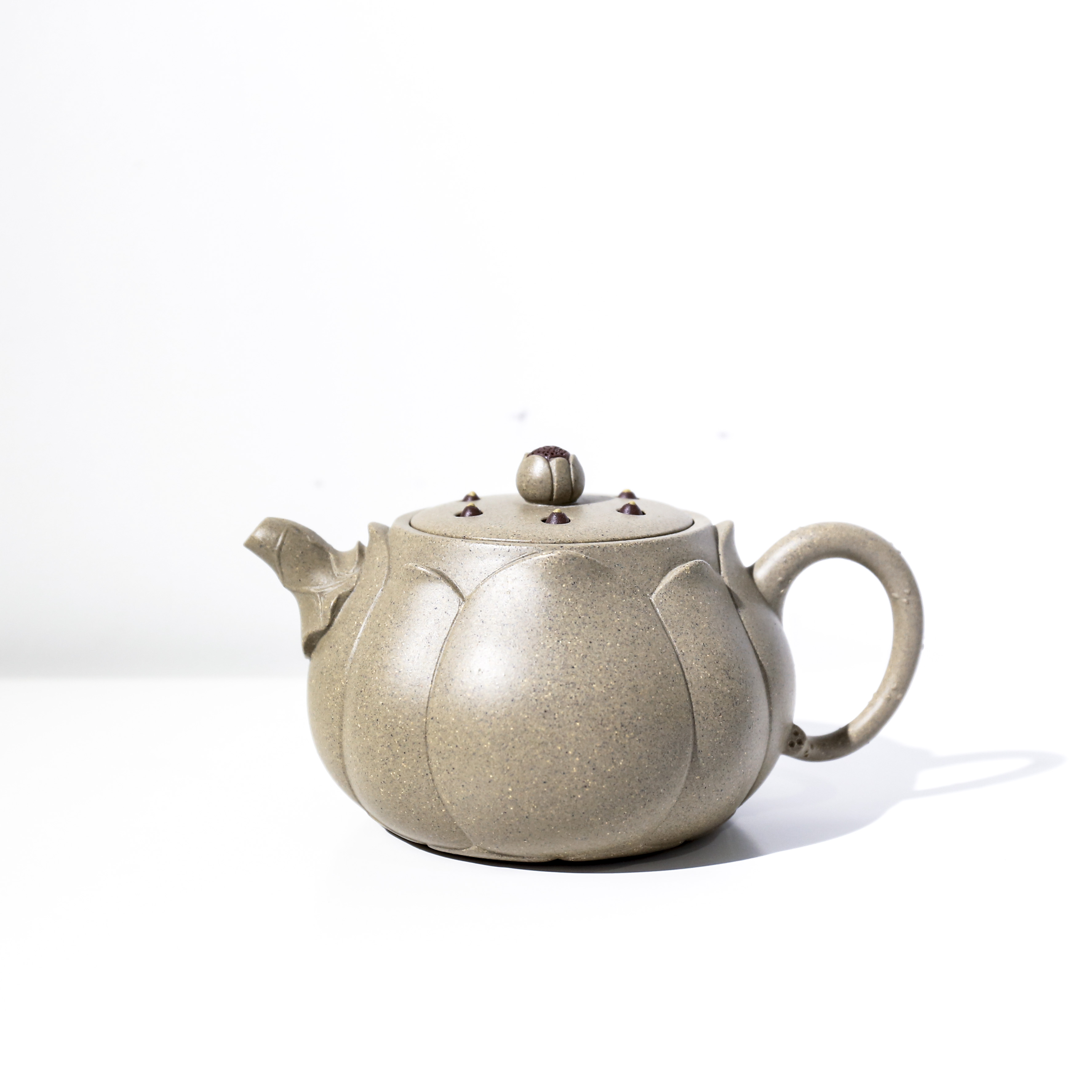 《蓮心壺》是宜興紫砂陶的花器造型精品。《蓮心壺》以一朵含苞欲放的荷花作壺身,卷裹的荷葉為壺嘴,以四周長(zhǎng)滿濃濃毛刺的荷花枝梗挽成壺把,荷花的花瓣,荷葉的經(jīng)脈都流暢自然。上方以蓮蓬作壺蓋,壺蓋上含苞欲放的花蕾為壺鈕,此壺整體造型比例協(xié)調(diào)、勻稱,線條流暢、優(yōu)美,體現(xiàn)了濃烈的生活情趣。